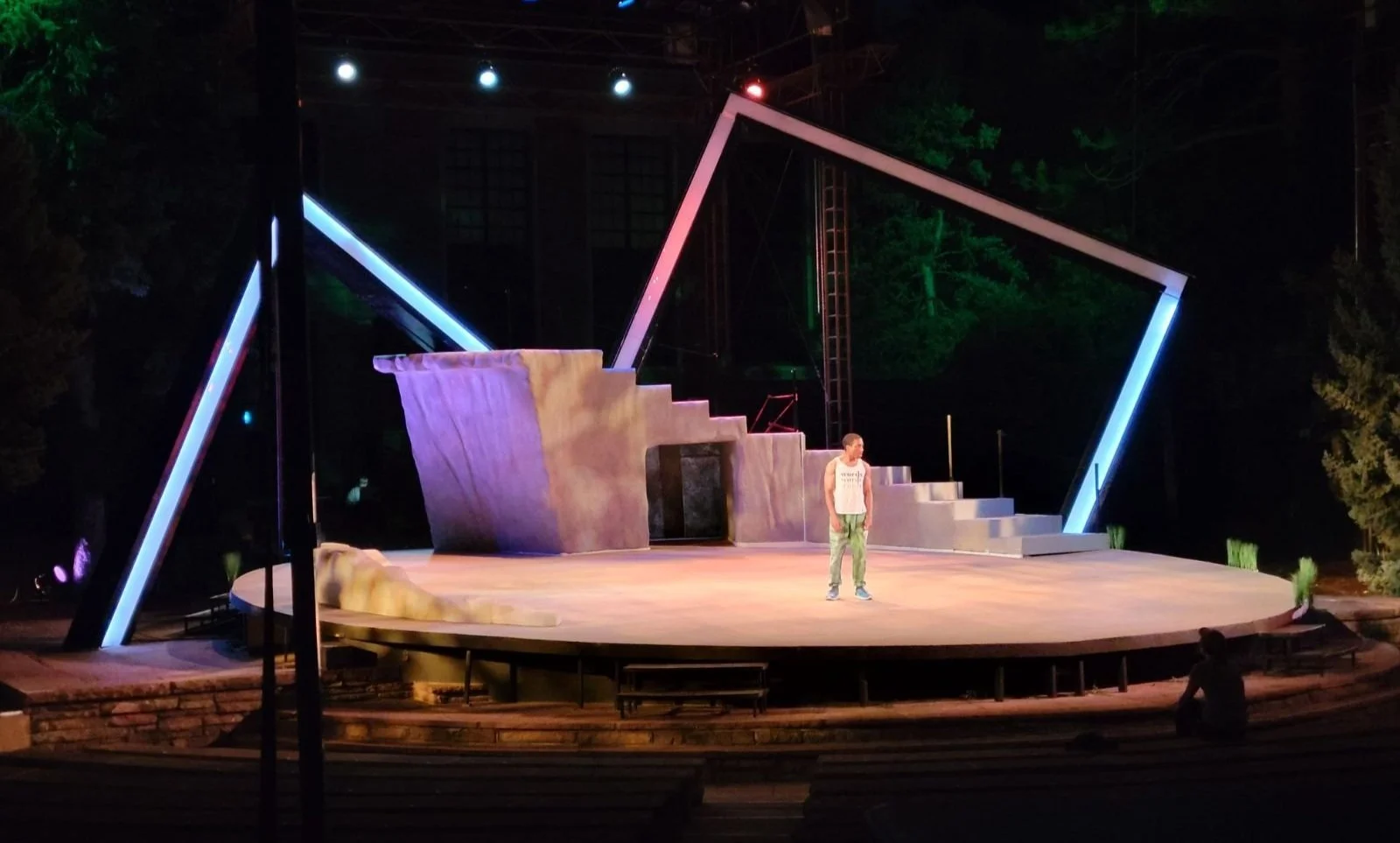 For a production of King Lear at Colorado Shakespeare Festival, we constructed a large curved staircase faced with foam in order to create a rock texture. We also constructed two steel frames with plexiglass faces for an LED effect.